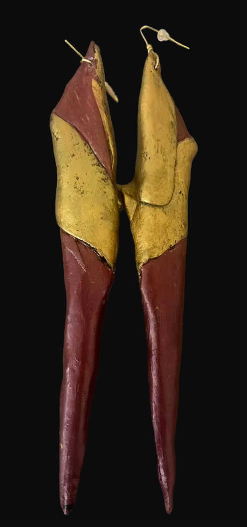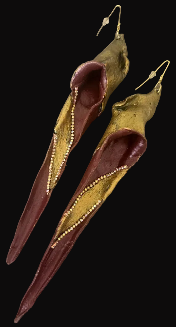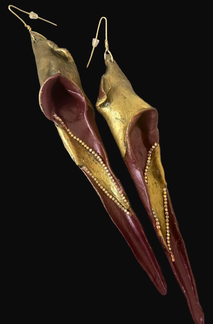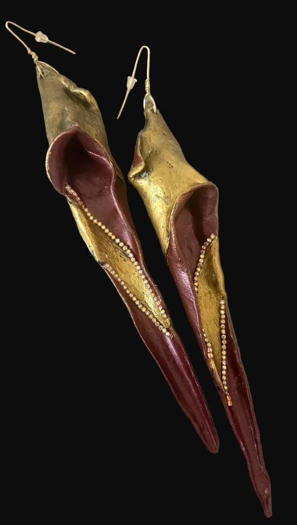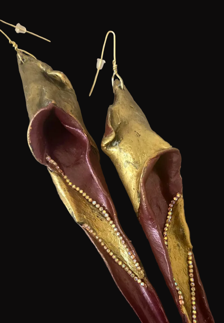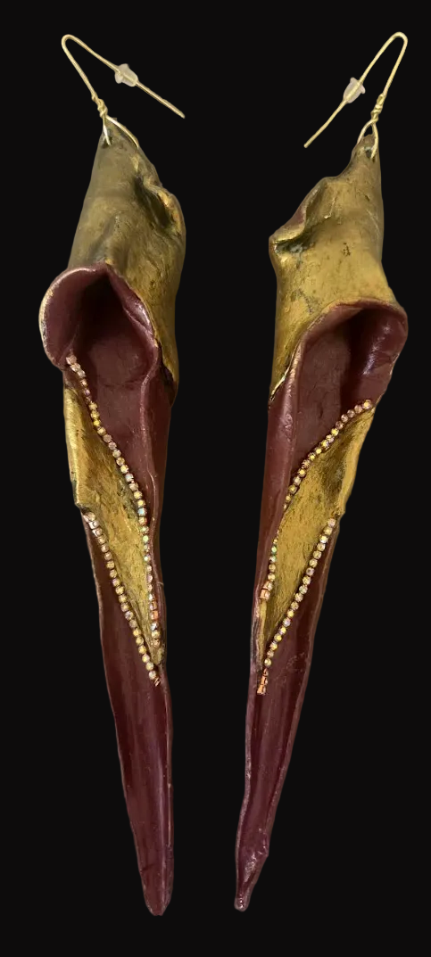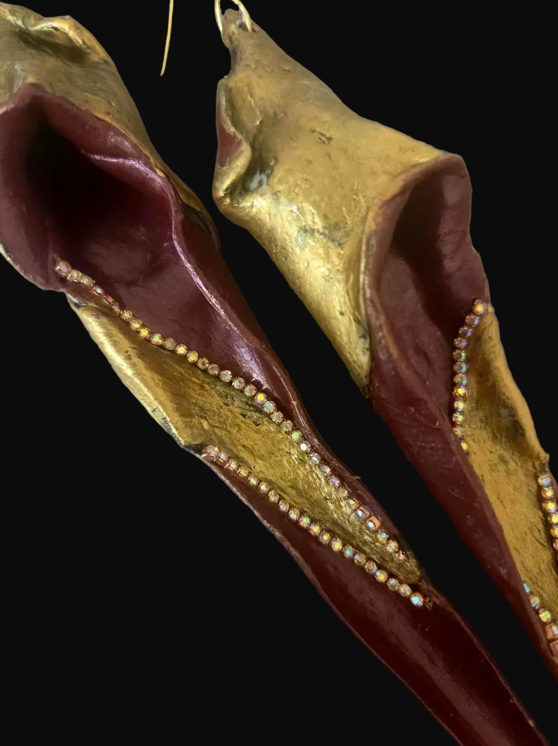 The Design: Hand-sculpted to mimic a prehistoric or botanical predator, these 9" x 1.5" vessels feature a weathered gold exterior that gives way to a deep, garnet or oxblood-finished interior. A delicate "spine" of aurora borealis rhinestone trim bisects the form, adding a flicker of light to the otherwise brutalist silhouette. Despite their staggering length, they remain true to my lighter than metal Architecture, engineered for a dramatic, unburdened presence. (I would assess these as moderate in weight)