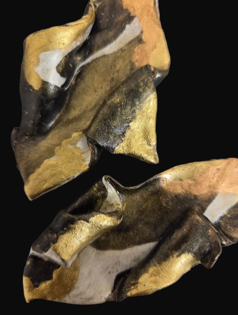 Layered in black, white, and ash-gray with flashes of metallic gold and rose gold micro-pigment, each fold feels molten and architectural — like metal caught mid-collapse. The asymmetry is intentional. The movement is alive. The finish catches light in a way that feels dangerous… but disciplined.