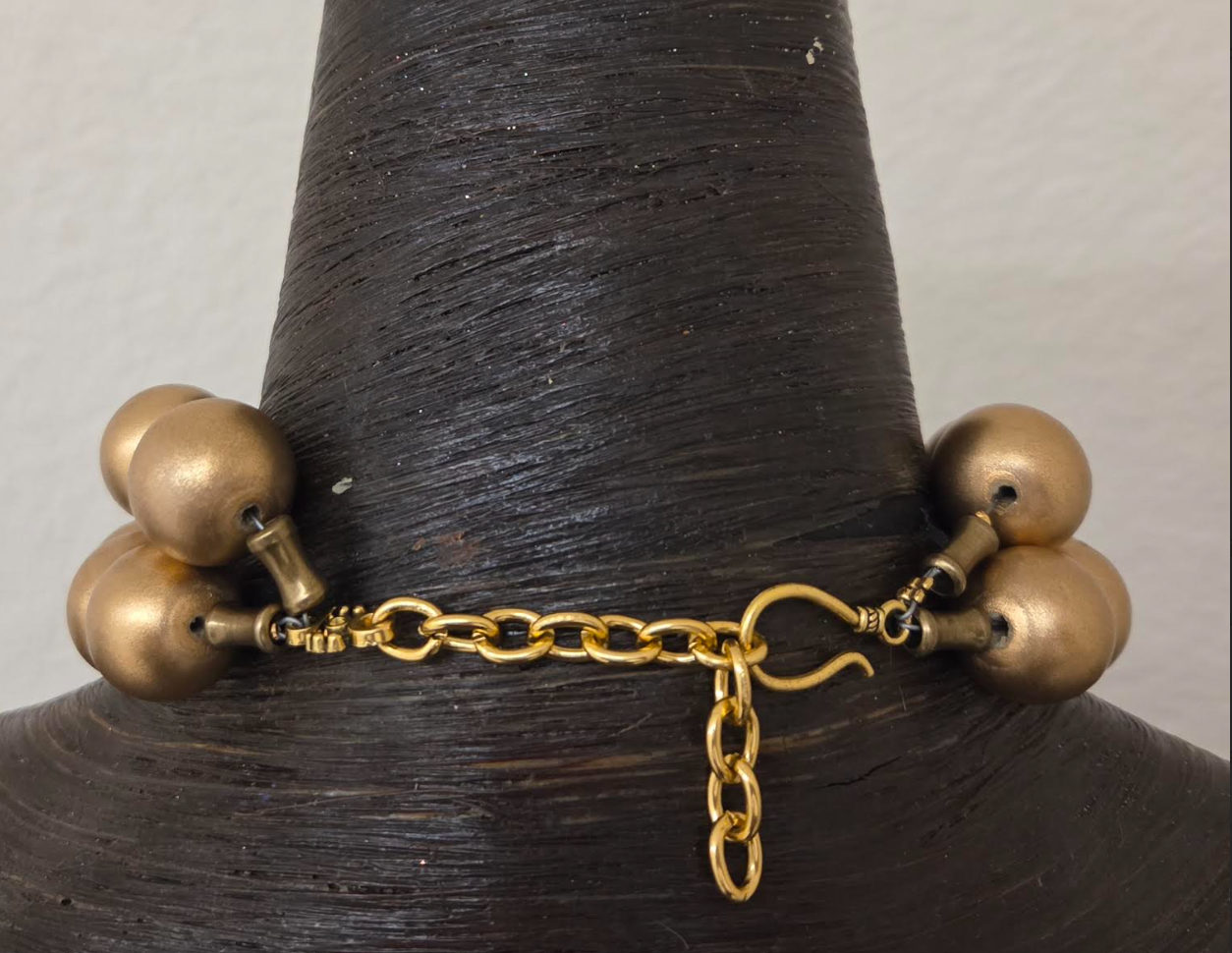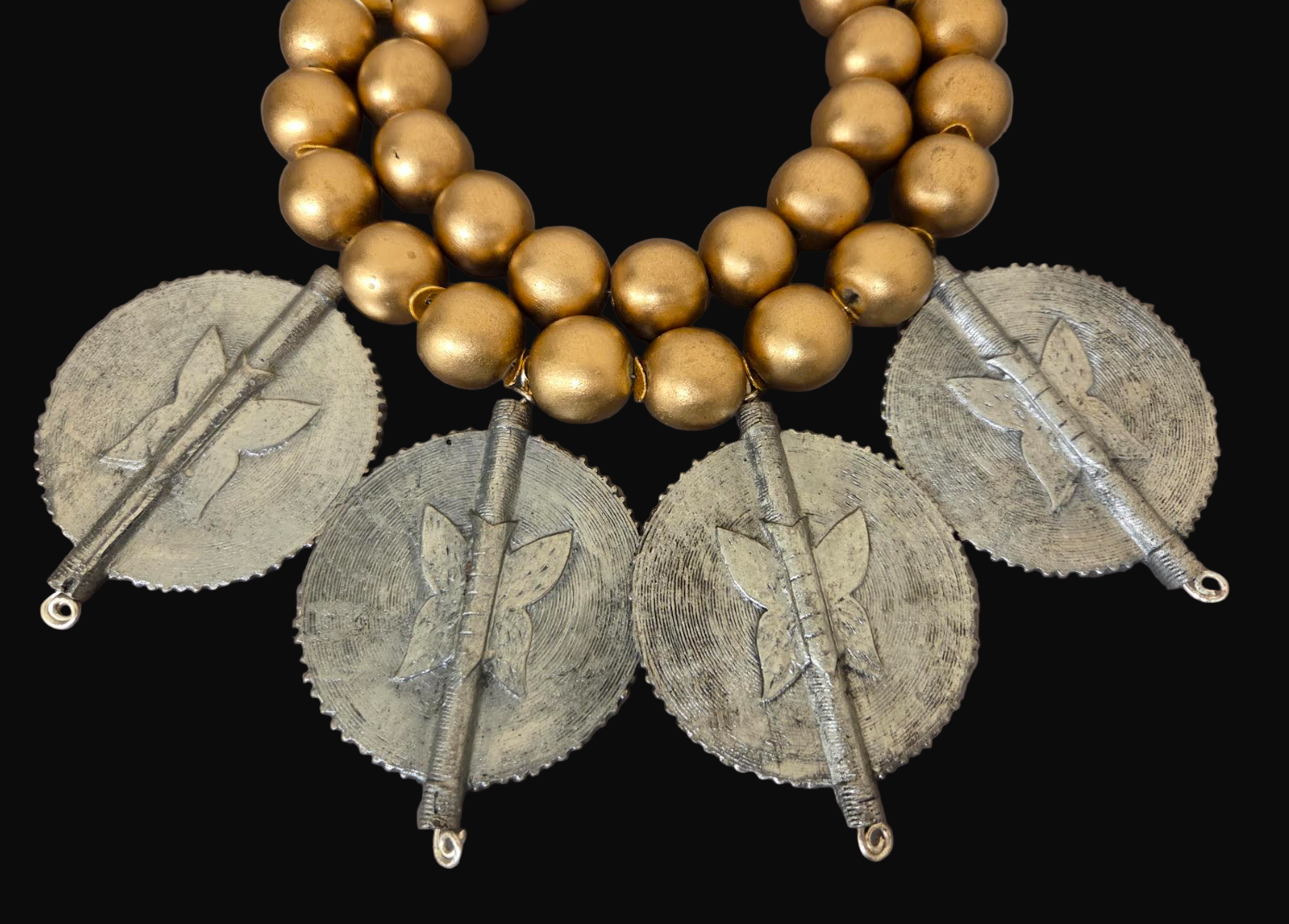 Here is a smaller version of the African lost wax brass Baule (Ivory Coast) sundisk tribal statement necklace finished with a butterfly motif and a silver tone metal casting. Adjusting from 16-18" the beaded portion is lightweight while the metal disks have some weight. The gold metallic wood beads are separated from each other with small gold tone wavy metal disks on the outer most strand. The inner strand has no spacers. I tried this on and I did not have any neck strain given that your sternum supports most of the weight. Closes with a gold tone metal hook and eye along with a 2" extender chain which I can lengthen free of charge. The mixed metals make this quite versatile. OOAK Wearable Art from the Atelier of Kat Kouture.