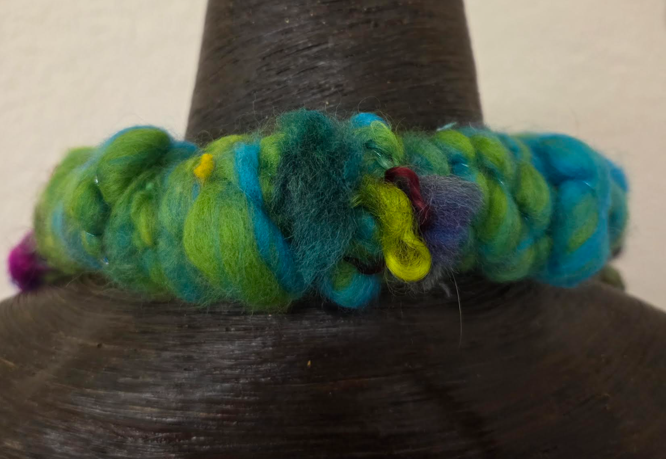 Hand-assembled from multiple strands of chunky art yarn and mixed fibers