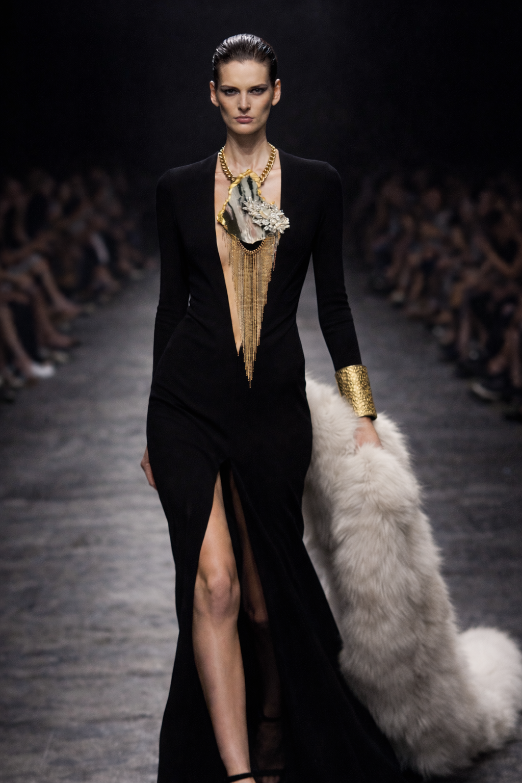 A brilliant Art Deco rhinestone jewel adds high glamour, while a cascading chain fringe waterfall brings dramatic movement and light-play with every step. This is wearable sculpture with serious presence—made for confident maximalists and runway energy.