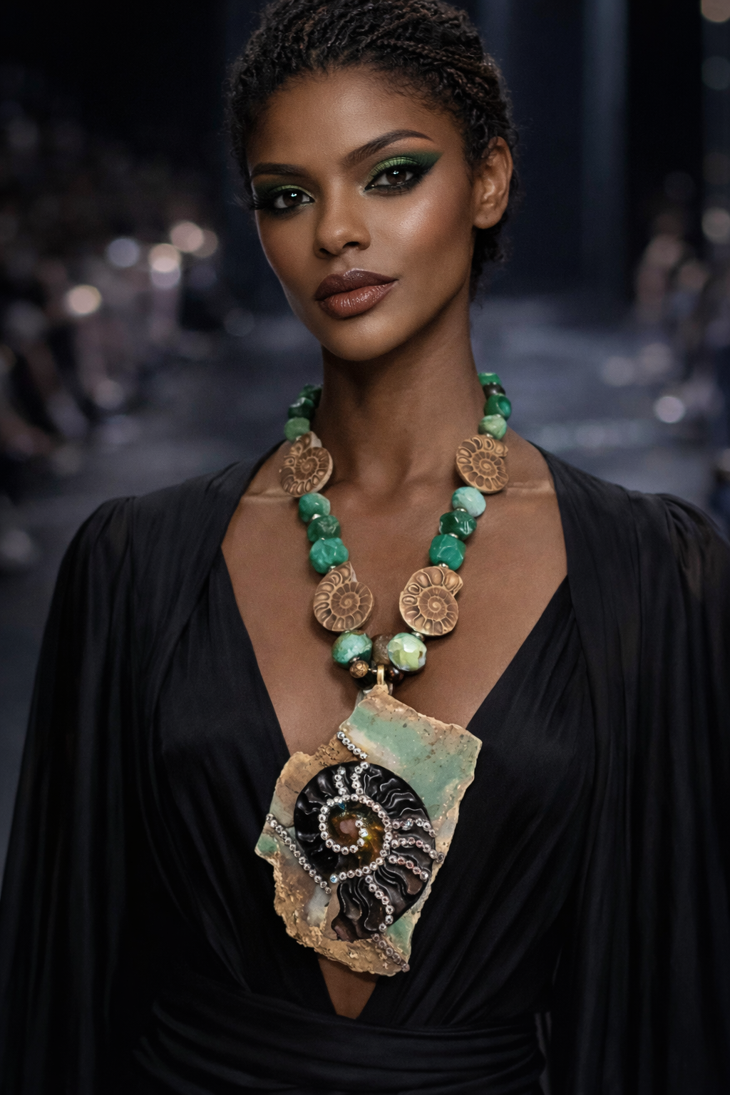 A collector-scale talisman featuring a rare chrysoprase slab accented with a black ammonite traced in aurora borealis rhinestones—equal parts earth relic and couture shimmer.