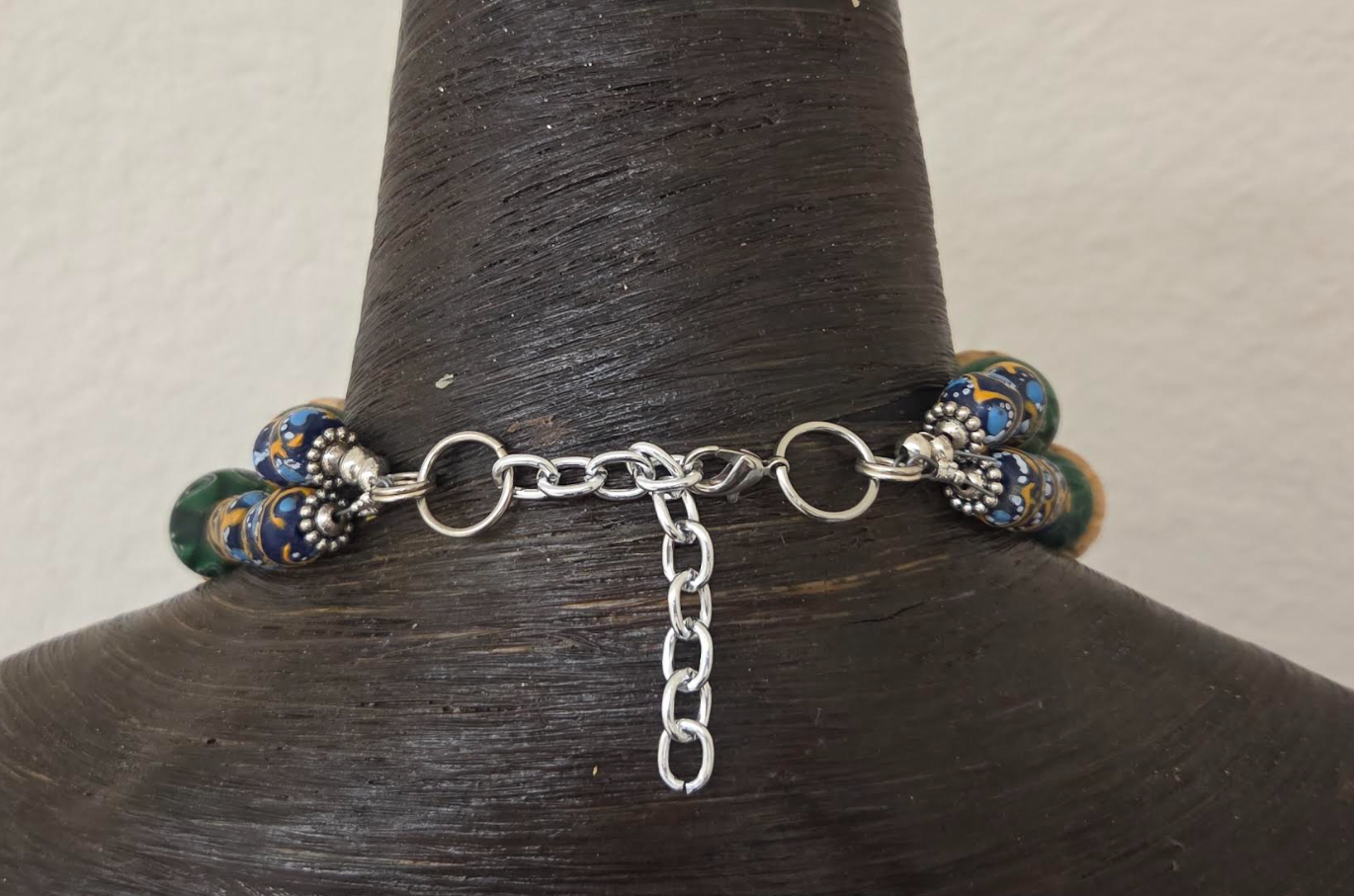 The double strand necklaces features Ethiopian hand crafted copper beads, bronze rhinestone rondelles, Zebu batik bone, wood beads, coconut spacers. and two types of hand painted African glass. The back is finished with tiny silver tone tribal beads and silvertone crimp covers. Adjusts from 20-22" and I can add more links if requested. Fastens with a small lobster claw clasp. From the Atelier of Kat Kouture! I would assess this piece to be of moderate weight.