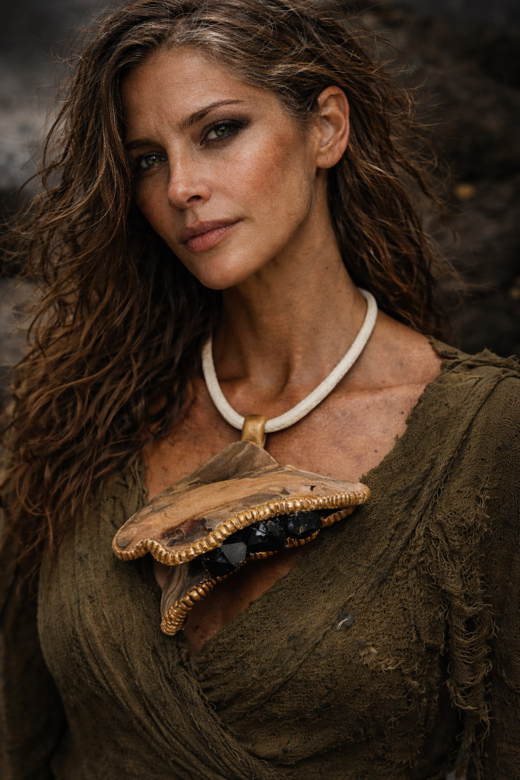 A savage whisper from the sea gods, this one-of-a-kind pendant fuses raw elemental beauty with hand-sculpted luxury. Rare brown earth-tone driftwood, smoothed by time and tide, forms the backbone of this statement piece—accented with golden bronze metallic sculpting and flanked by triple rough smoky quartz points pulsing with grounded energy.