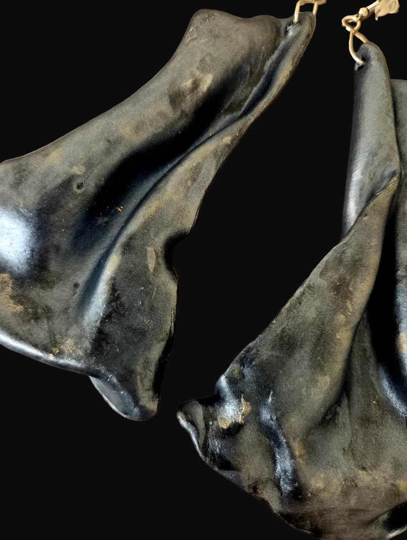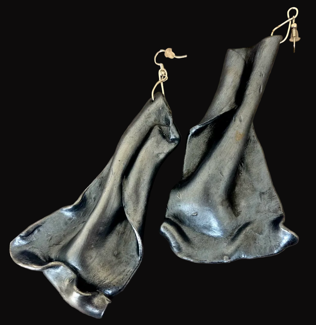 The Design: Measuring approximately 6" x 2.25", these pieces are hand-sculpted to create cavernous folds and sweeping, blade-like curves. While they possess a moderate weight that reinforces their "Heavy Metal" aesthetic, they remain balanced for the wearer. The deep pewter finish provides a sophisticated alternative to traditional gold, offering a versatile "Industrial Neutral" that pairs effortlessly with a modern wardrobe.