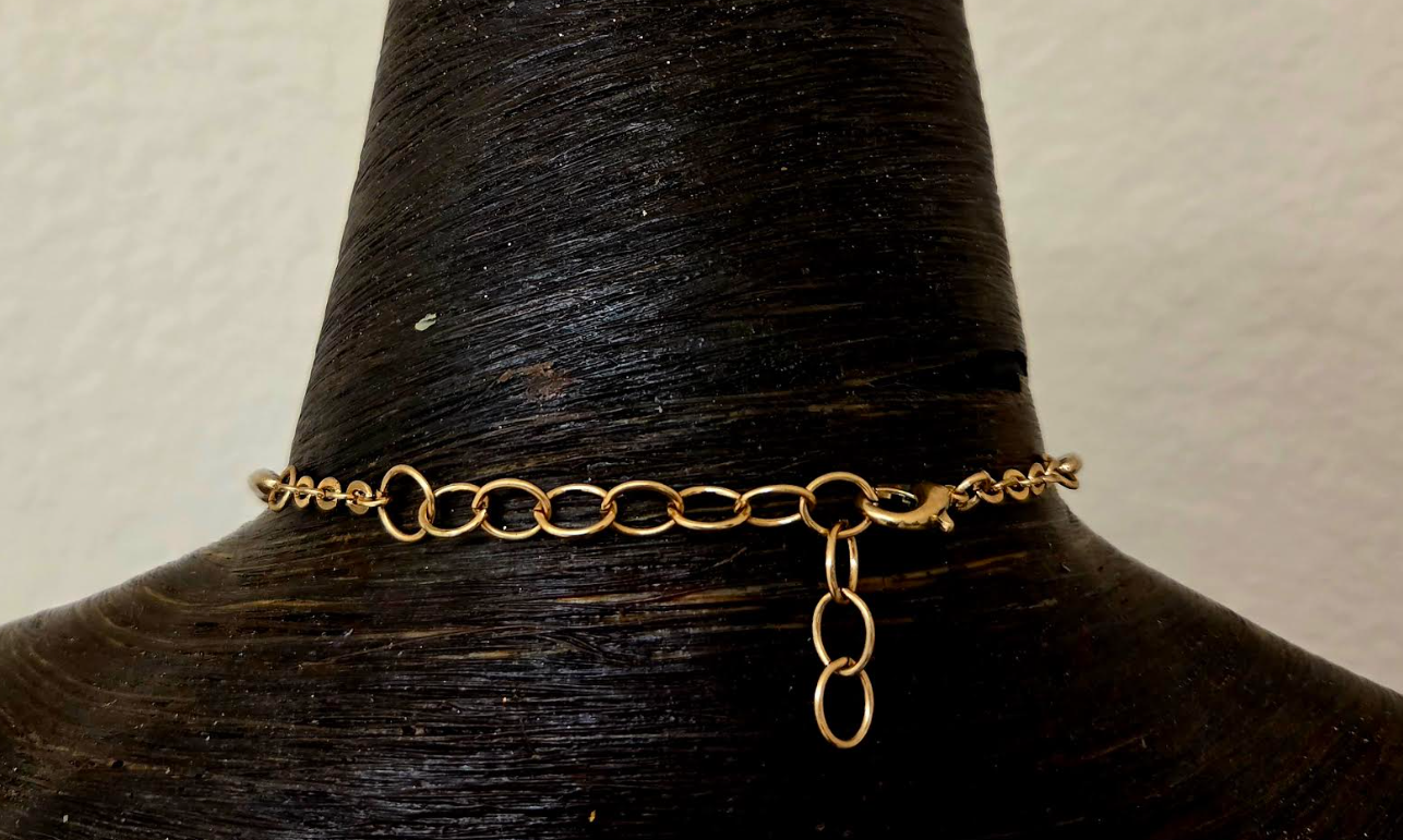 Mounted on a minimalist hammered, gold tone wire torque, this piece fuses maximalist fantasy with sleek restraint. The chromatic shift from hot magenta to acid green catches the light with holographic intensity. It reads high fashion. High frequency. Unapologetically loud.