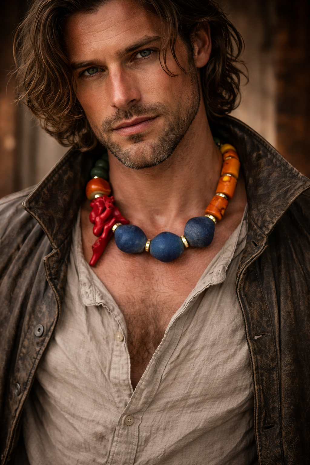 The deep cobalt blue glass beads anchor the composition, their rich translucency evoking the essence of ocean currents. Several striking pieces of raw red coral add a fiery contrast—organic, untamed, and rich with movement. Interspersed between them, Moroccan green and yellow resin beads bring warmth and depth, their bold hues reminiscent of sun-drenched desert landscapes. Finishing the piece, rhinestone rondelles inject just the right touch of sparkle, elevating the necklace’s artistic dynamism with elements of high-glamour flair.