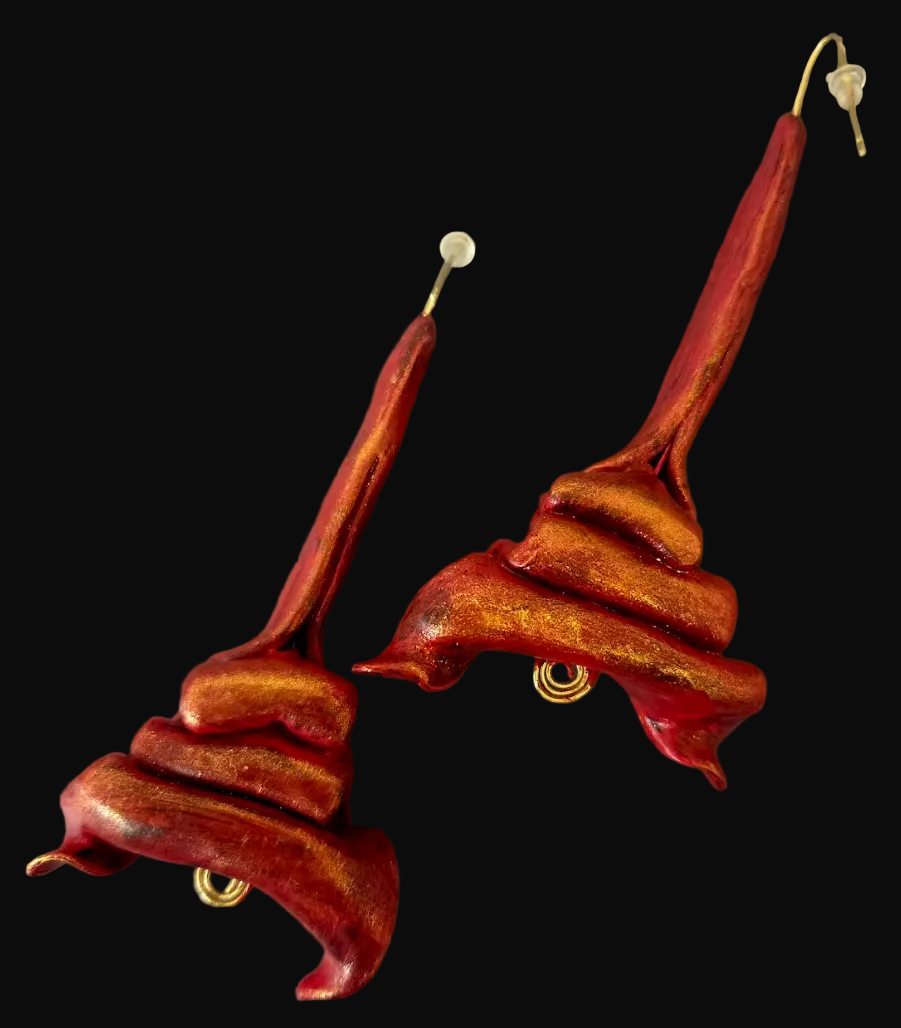 Hand Sculpted Fiery Red & Gold Shoulder Duster Pierced Earrings - Hot