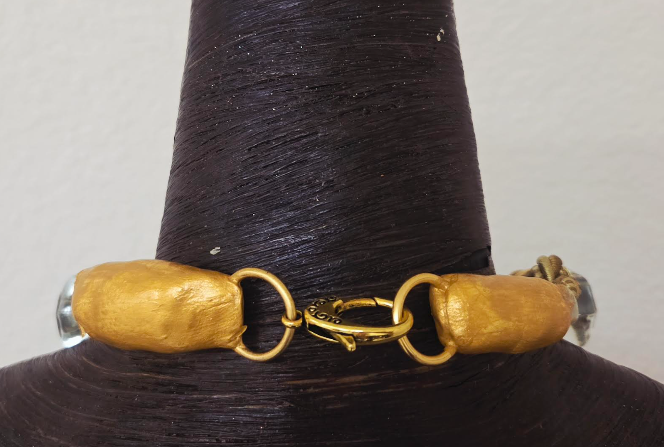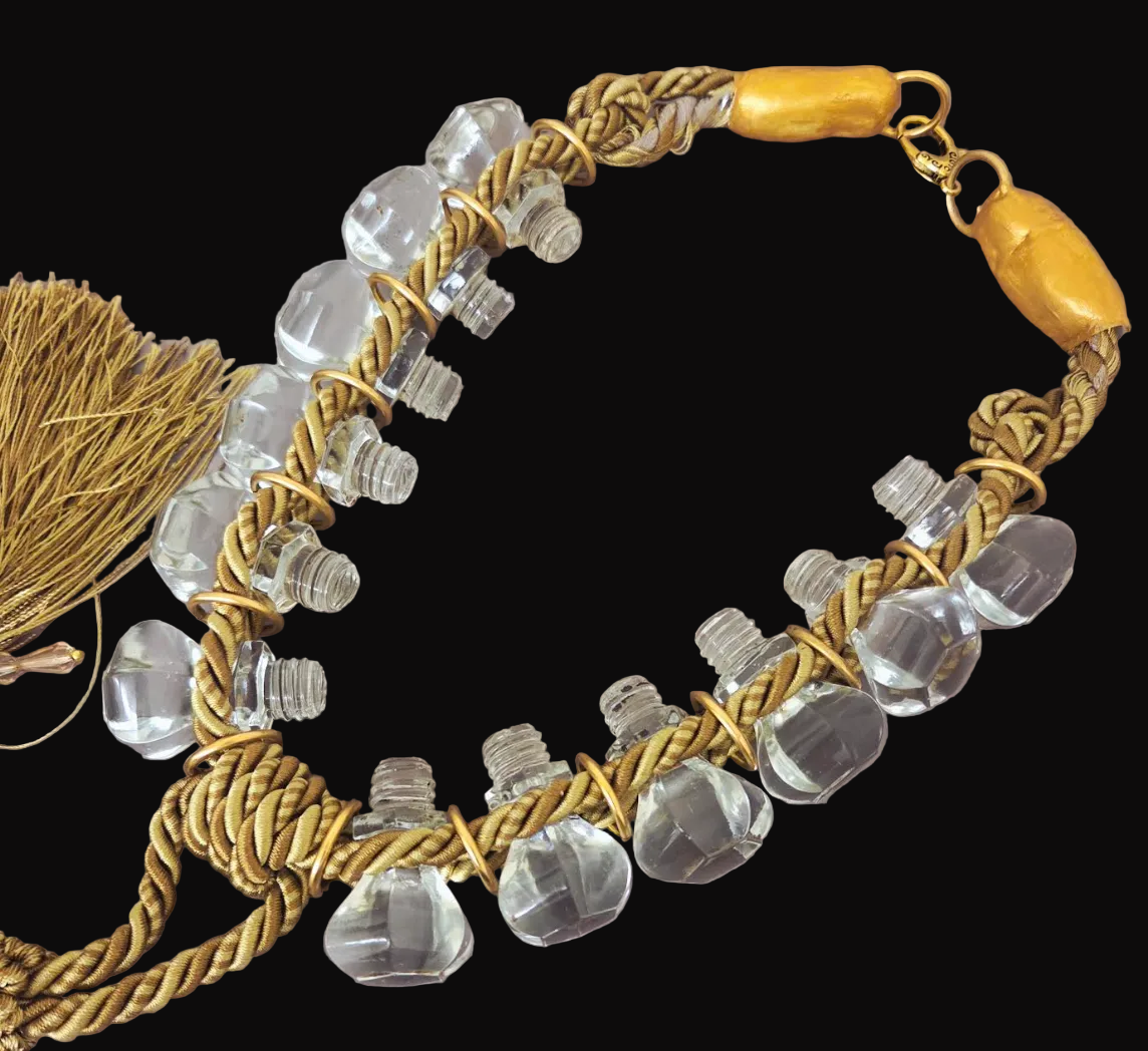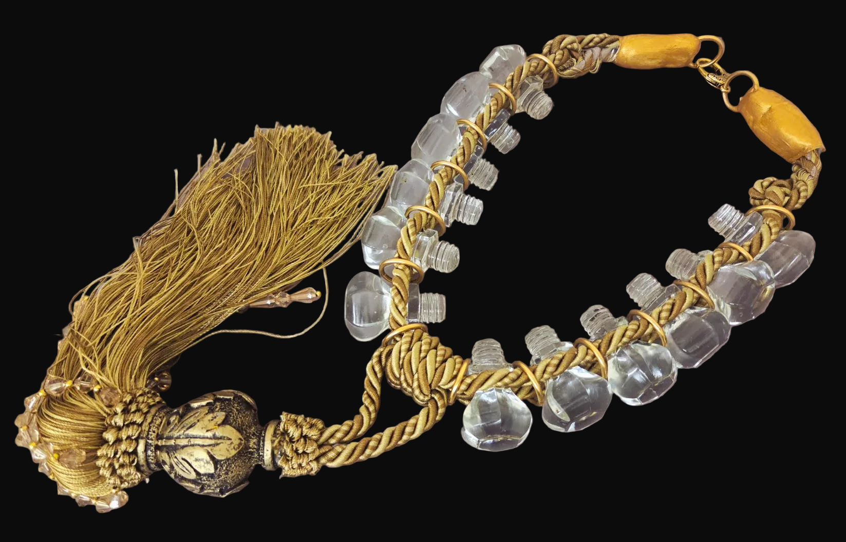 A high-art assemblage statement necklace - chest piece that turns overlooked domestic objects into a gilded relic. Faceted glass cruet screw tops become a luminous collar—ice-clear “stones” captured in warm brass rings—then anchored by a dramatic drapery tieback tassel in antique gold with whispers of green. The result is equal parts adornment and object d’art: architectural, ceremonial, and unapologetically bold.