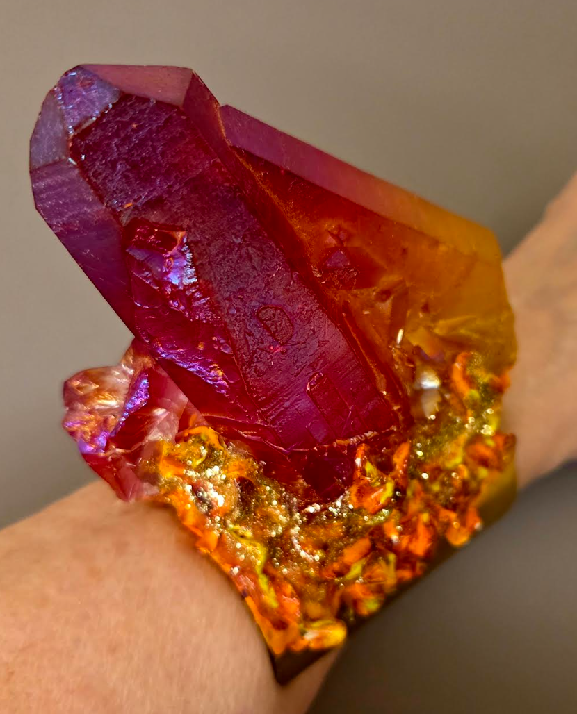 This blazing statement cuff looks like it was pulled straight from the heart of a star. A towering red–gold–orange aura quartz point stretches dramatically across the wrist, surrounded by a dense cluster of smaller crystals that glow in fiery citrus and amber tones.