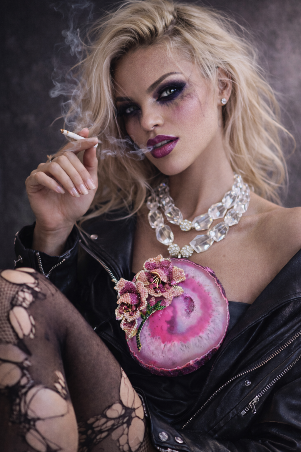 Exploding from the surface: a bouquet of rhinestone-studded roses, blooming in cascading shades of blush, magenta, and silver—each petal glistening like a whispered secret. Suspended from a double strand of 36mm faceted clear glass crystals, rhinestone rondelles and rhinestone balls, this piece catches the light from every angle and refuses to be ignored.
