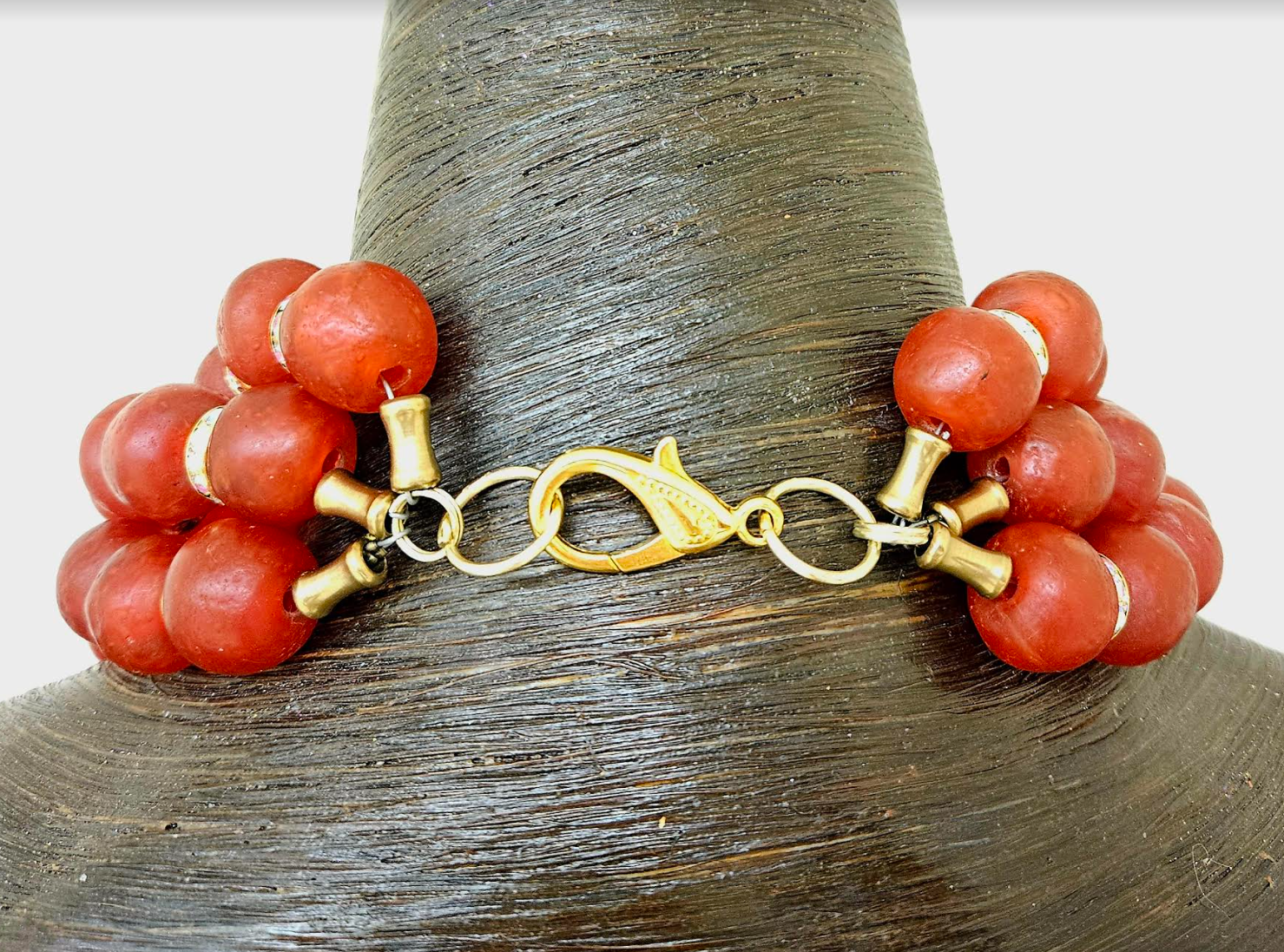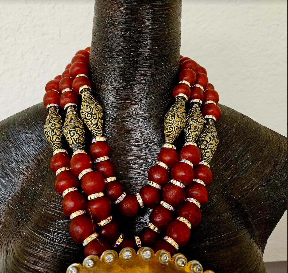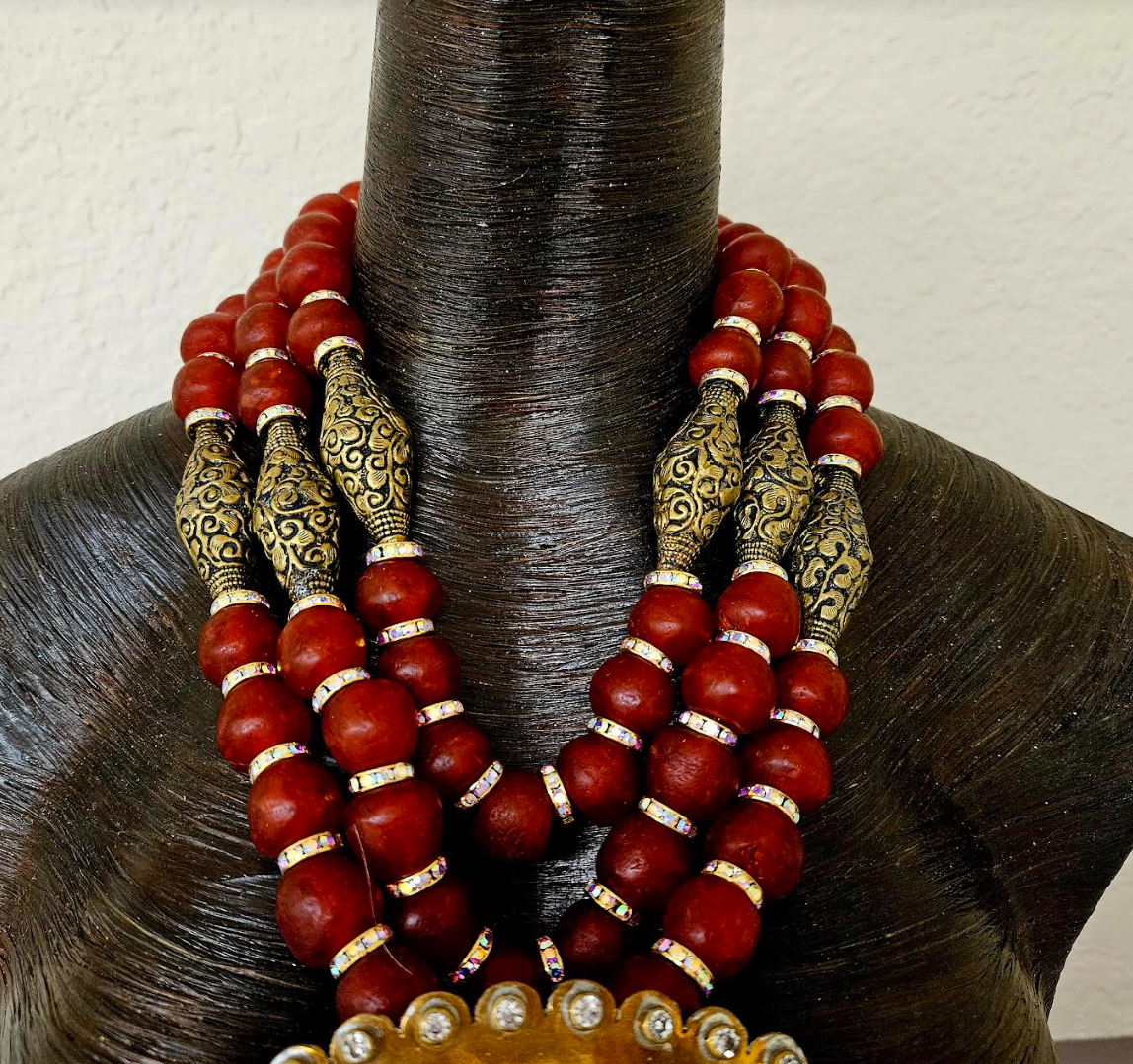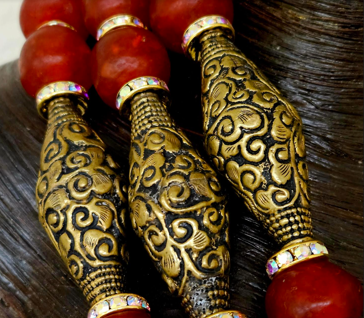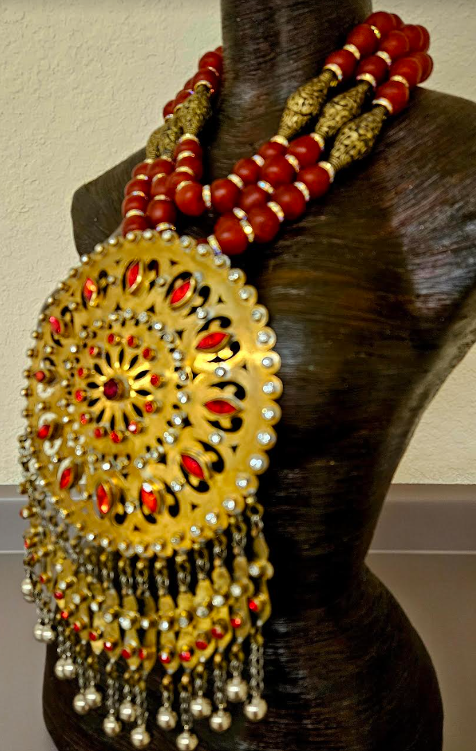 From my private vault and unworn. I have never seen a vintage tribal - ethnic breast plate like this before. The round portion measures 7" in diameter and 12" in length from the top of the pendant to the very bottom of the dangles. The pendant is brass with inlaid red glass, crystal or rhinestone. Scattered throughout are clear stones. All the stones are intact, as are the dangles. The dangles make a soft and lovely jingle-jangle when moved. Suspending the pendant are three rows of African recycled ruby red frosted glass with golden aurora borealis rhinestone rondelles. Six ornately crafted Tibetan Brass Repousse bicones beads are used as accents (3 on each side). There appears to be a swirled plant motif on the beads but the abstraction makes it challenging to know for certain. I wish I could recall the origins of the pendant, but I guarantee this is almost hypnotic in it's beauty and mysticism. Non-adjustable 21" in length with gold tone hardware and a lobster claw clasp. The pendant is lightweight, but the necklace has some heft, so please know your tolerance before you buy. OOAK Wearable Art from the Atelier of Kat Kouture!