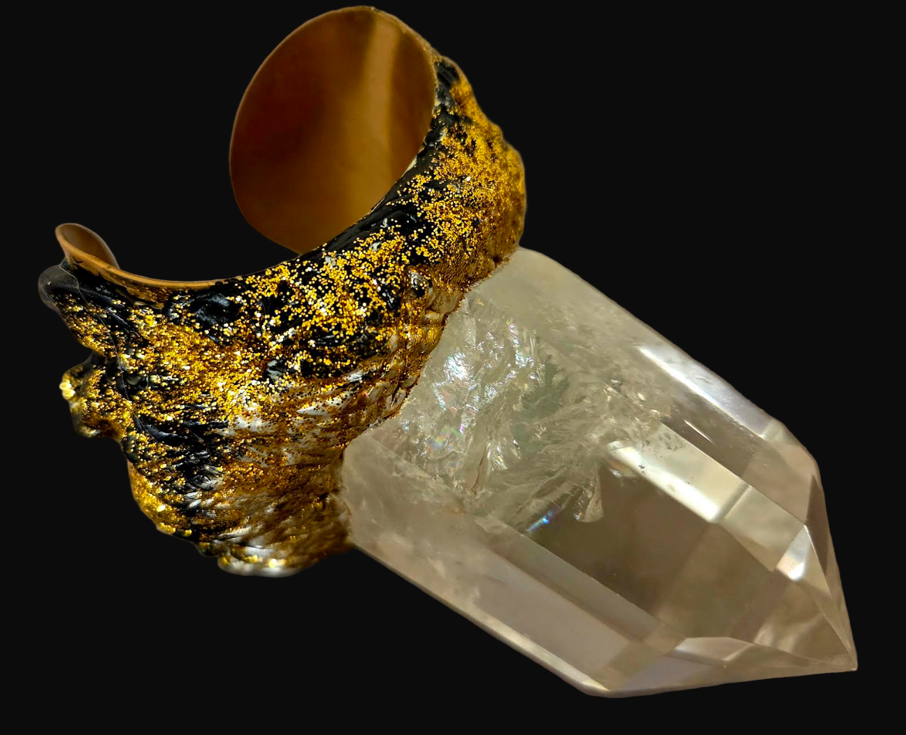 This commanding Kat Kouture statement cuff embodies the raw power of crystal architecture and couture design. A towering phantom quartz point rises from a hand-sculpted base, its transparent form revealing delicate inclusions that seem to suspend time itself. The cuff’s gold-black-copper glitter ombre-like finish evokes molten metal cooled into leaf-like textures — a fusion of earth and alchemy that radiates pure opulence.