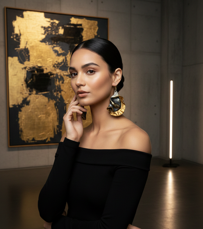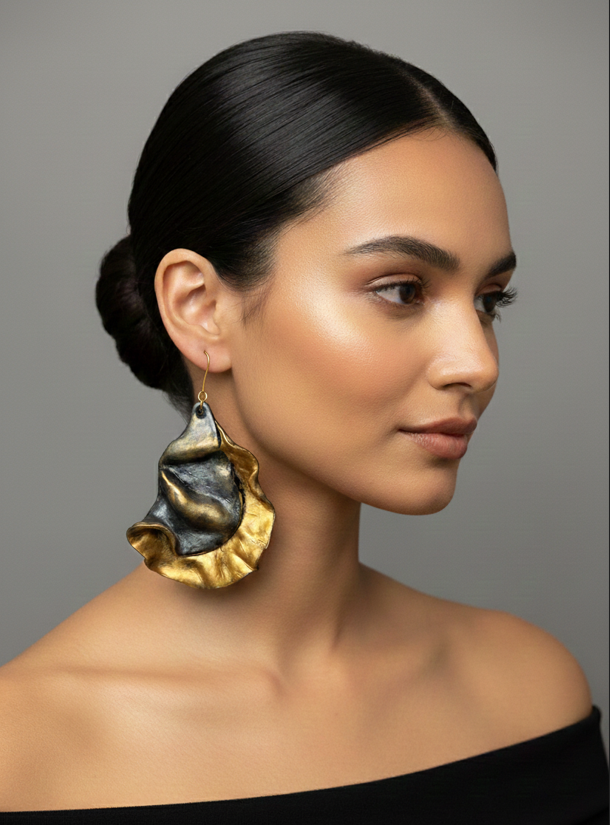 The Design: Measuring 4" x 2", these pieces feature a dark, weathered grey core that erupts into a vibrant gold-tone edge. The complex folding technique creates a cavernous architecture, capturing light and shadow within the sculpted depths. They are finished with gold-tone ear wires and secure silicone backings to accommodate their intentional weight.