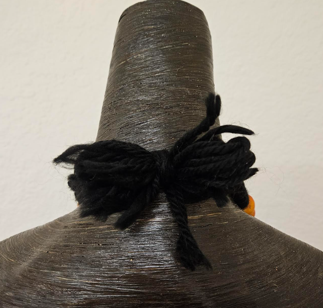 The piece has three strands of Moroccan resin beads that average about 1" each, all of which are strung on multiple strands of black yarn. Two triangular shaped resin strand separators are on each side while the back is finished with more beads. Ties in the back. (some of the black yard strands are different lengths, but this does not affect the security of the piece. This will adjust to accomodate most if not all.