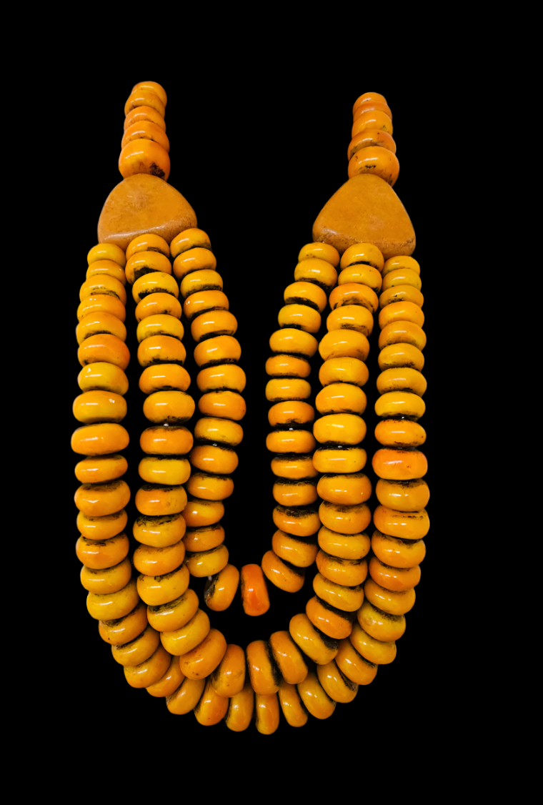 Make a commanding statement with this magnificent triple-strand Moroccan resin chest piece, a bold embodiment of tribal artistry and enduring style. The rich, honeyed tones of the hand-carved Moroccan resin beads cascade in a luxurious profusion, creating a captivating visual texture and a palpable sense of heritage. This exceptional, one-of-a-kind adornment speaks to a discerning appreciation for unique design and globally inspired elegance, transforming any ensemble into a work of art. Unisex designed.