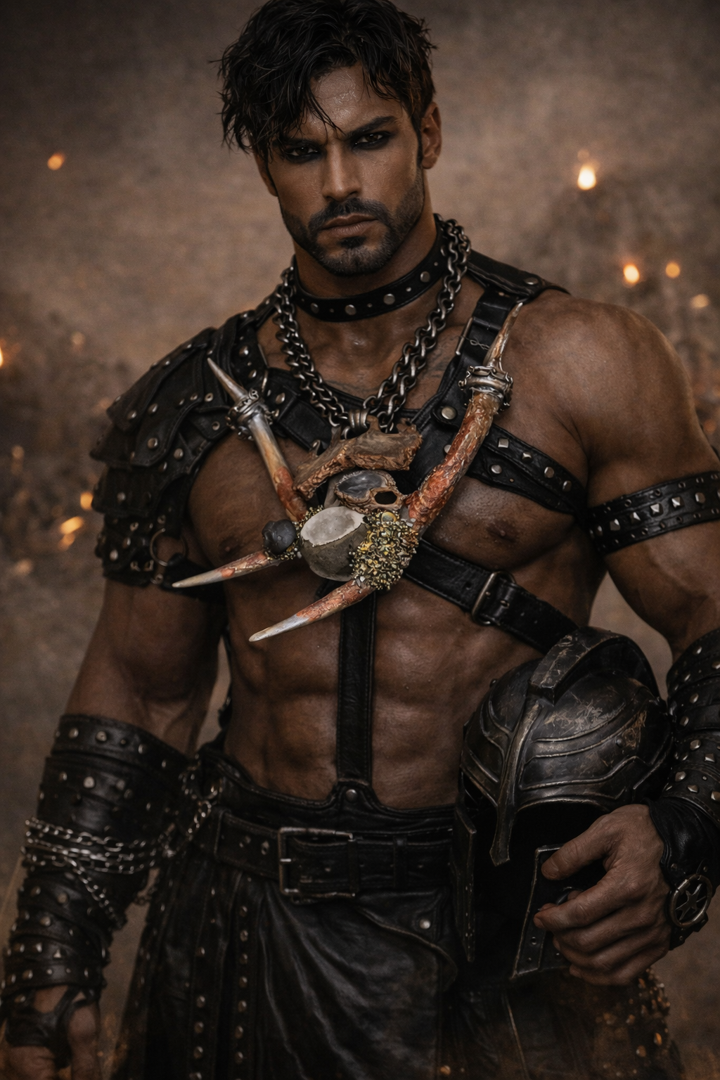 Easy slip on Styling over the head. Attached chain is a Rustic looking heavy brass or bronze. Painted to look as if the antlers were "rusted" - sealed with a high gloss glaze to protect the finish. Eccentric Mixed Media Urban Organic. A great men's look. Perfect for Photoshoots