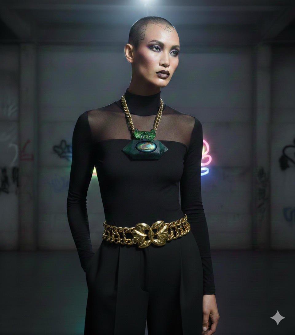 The stone is crowned with a hand-sculpted bail detailed in iridescent micro-pigments—a purple/green/bronze finish that feels otherworldly and couture. Please note: this piece has noticeable density and weight, giving it that “collector object” presence on the body.