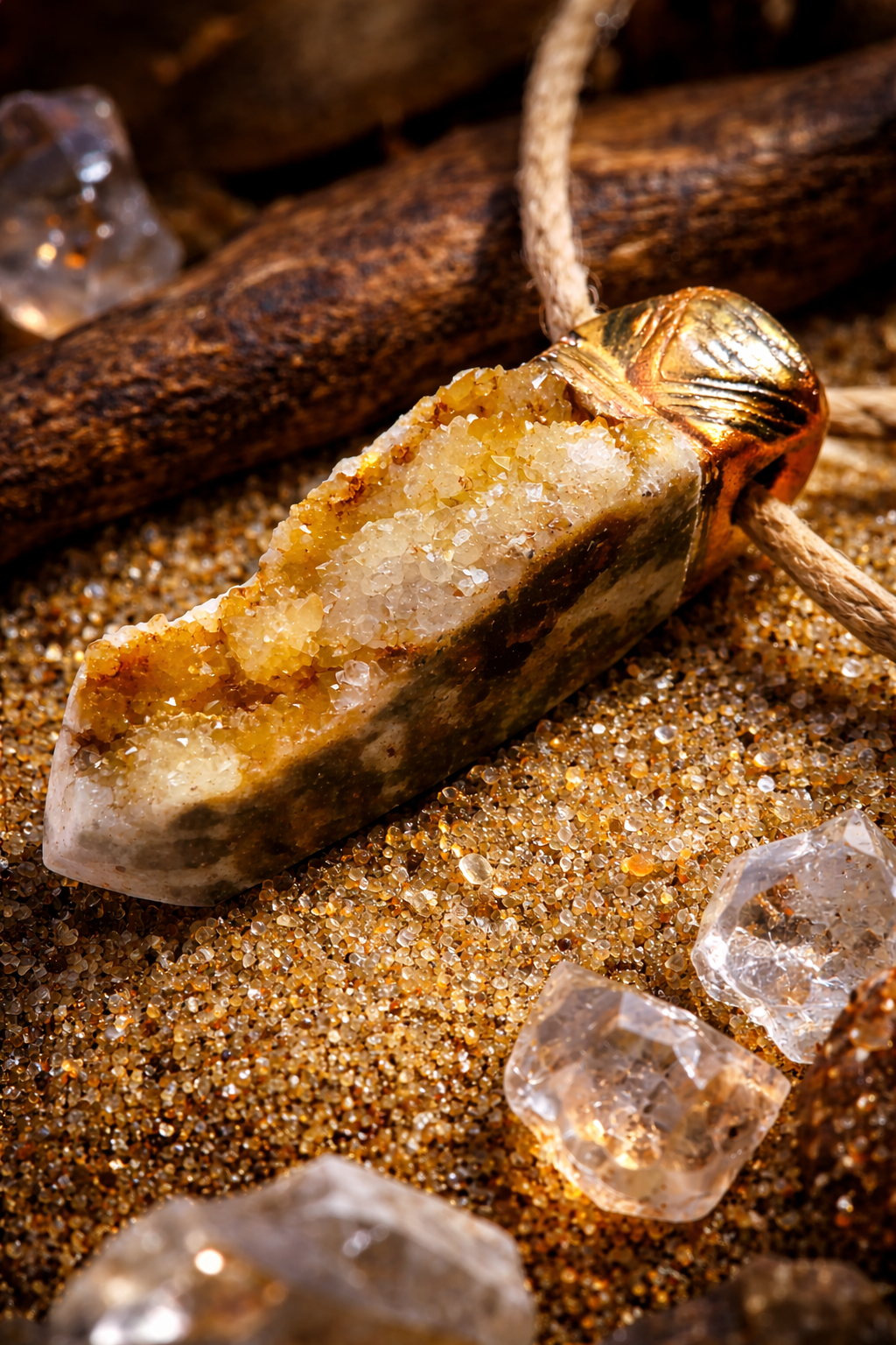 The obelisk is secured in my hand-sculpted proprietary setting, kissed with metallic fairy-dust shimmer and sealed beneath a high-gloss protective glaze for a luminous finish. It’s suspended from a 28" jute/hemp rope, closing with a dramatic silver-tone double dragon head clasp—fierce, mythic, and unmistakably statement-making.