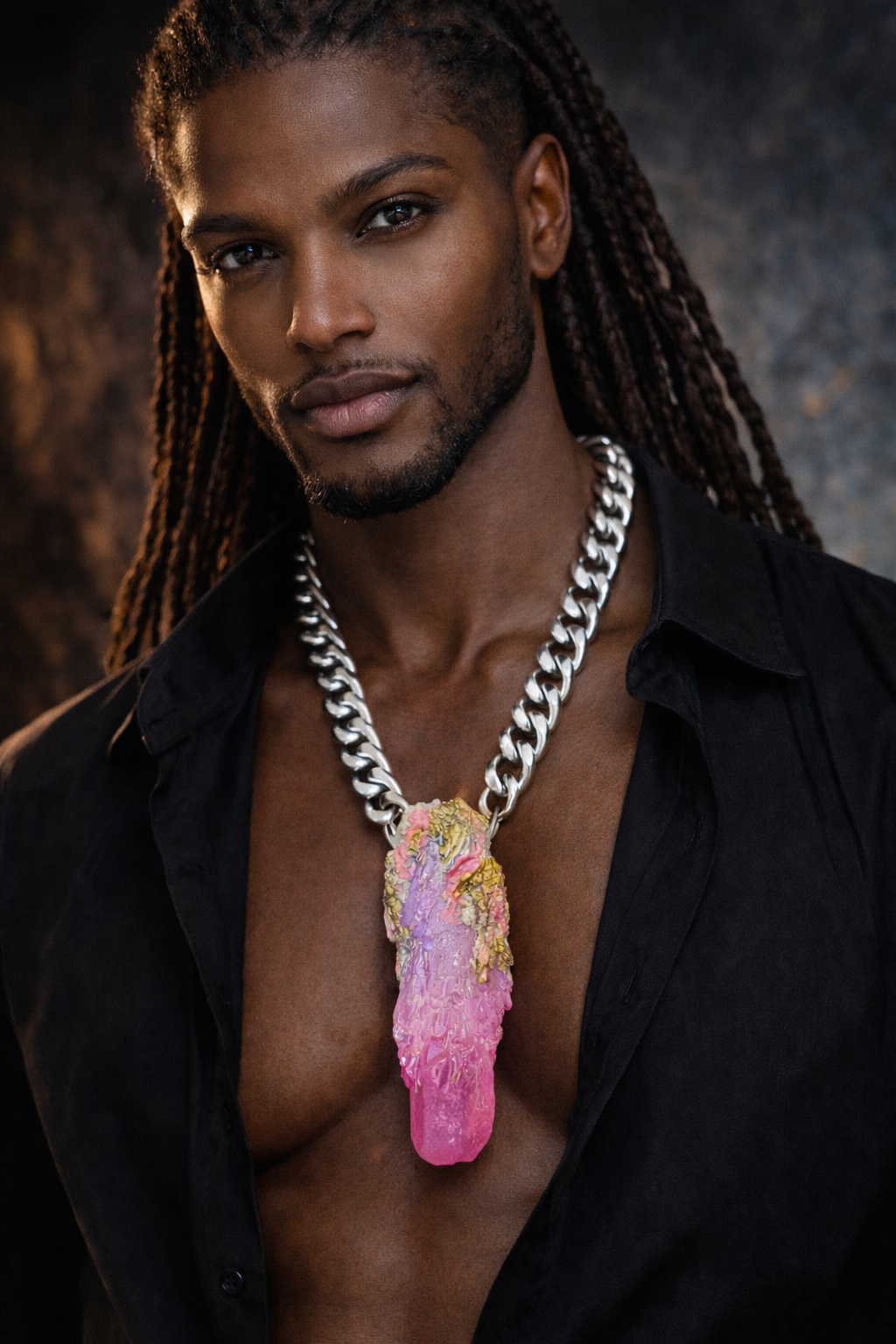Here's yet another piece I neglected to list. This feminine pink and lavender aura, record keeper quartz pendant measures 6" x 2" and is set in hand sculpted proprietary material which I painted and glazed. Two bold silver tone cable link chains suspend the pendant from each side with a drop of 13" per side. This is a comfortable gemstone piece of moderate weight. Closes with a lobster claw clasp. OOAK and exclusive art to wear from the Atelier of Kat Kouture!