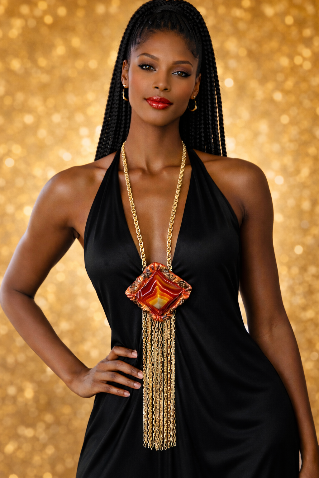 The black spot you see near the tip of this four-sided pyramid is NOT a flaw, but rather just a natural inclusion within the reddish-brown banded agate. I set a four-sided red agate pyramid into hand sculpted material, painted it then sealed it with a high-gloss glaze. 6" of vintage gold tone waterfall chain are suspended off the bottom of the piece with the entire pendant measuring approximately 10" x 4". A fancy and heavy gold tone vintage chain is suspended from the piece with a drop of 16" making this best for either a tall woman or man. There is no clasp on this chain. It simply slips on over your head. This is a great little piece when you need something casual, yet bold. OOAK Wearable Art from the Atelier of Kat Kouture!