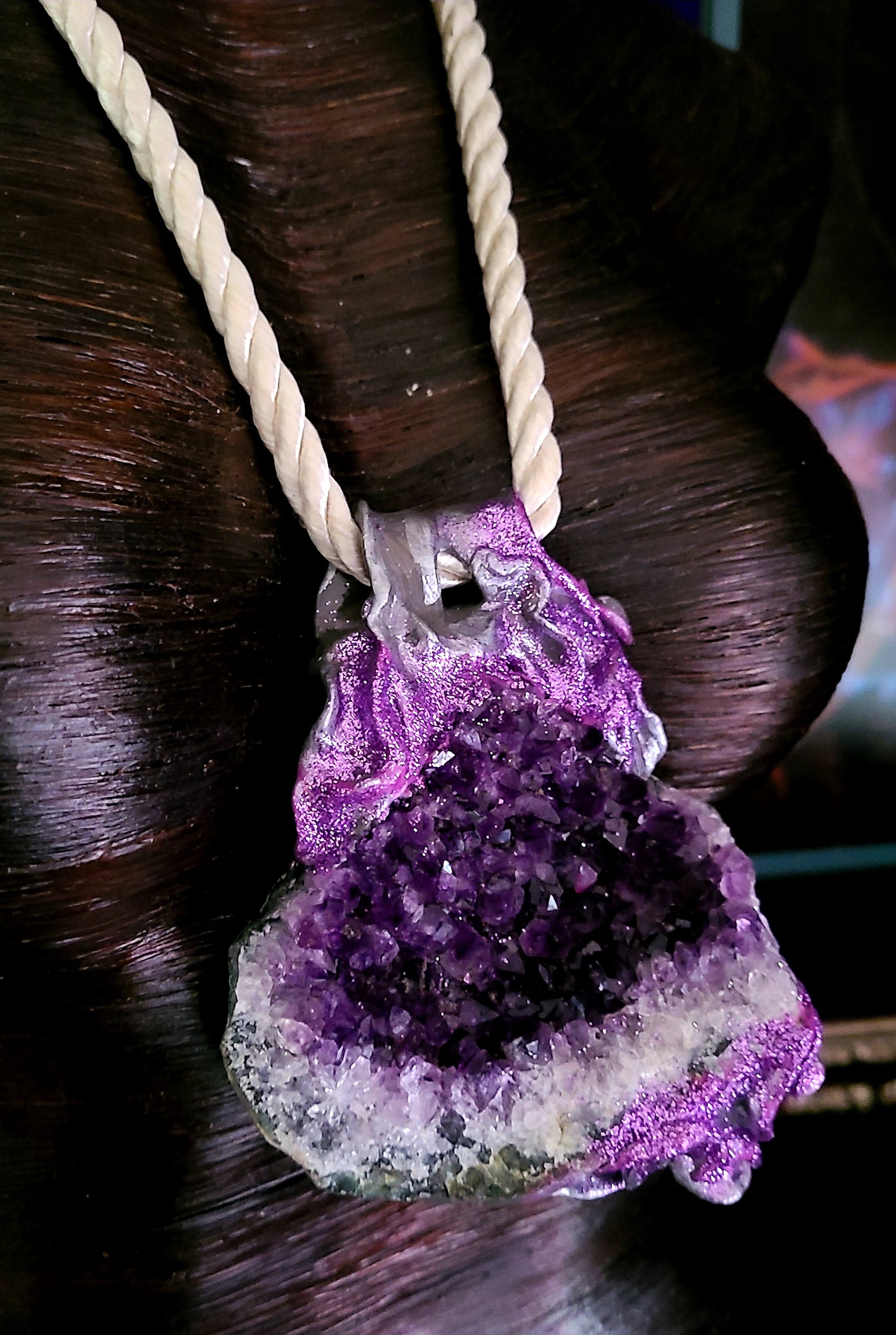 Rough Amethyst Sculpted Pendant on a Satin Cord - Purple Crystals