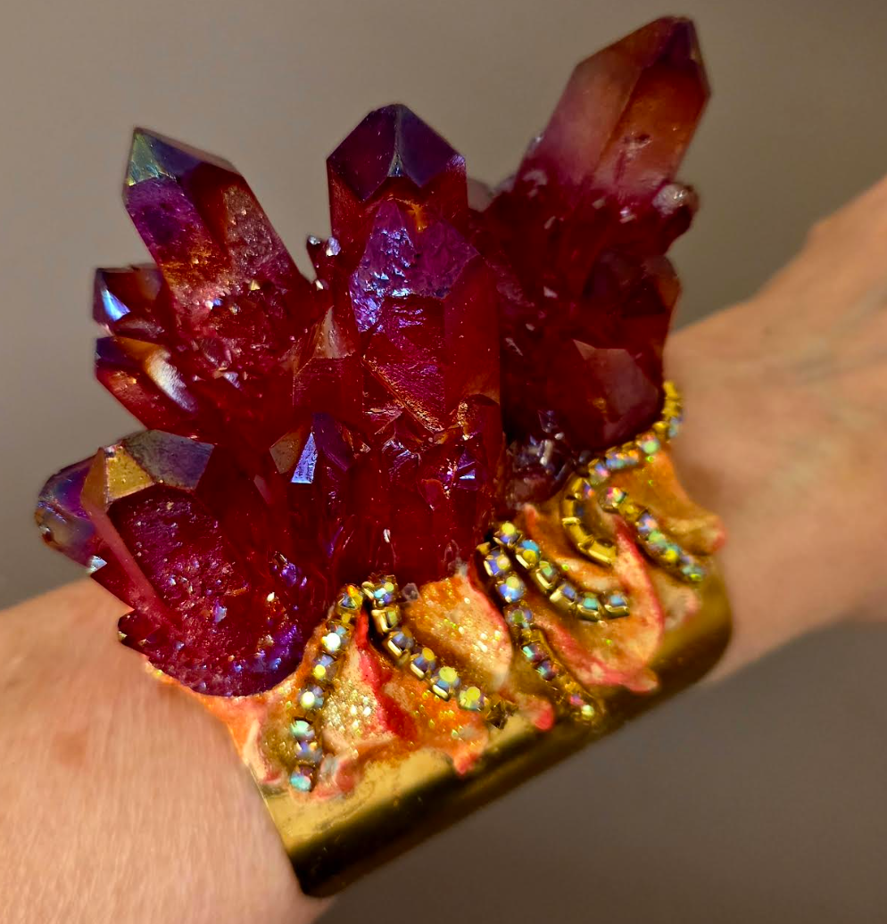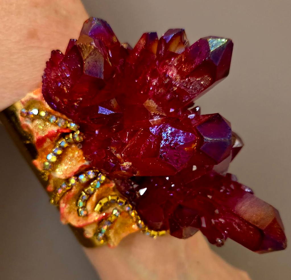 This fiery Kat Kouture cuff is pure drama on the wrist. A dense cluster of deep ruby or crimson quartz points rises from a hand-sculpted base, creating a crystal “cathedral” that glows with rich, ember-like color. Iridescent rhinestone chain traces the edge of the cuff, catching flashes of gold, pink, and electric blue as you move.