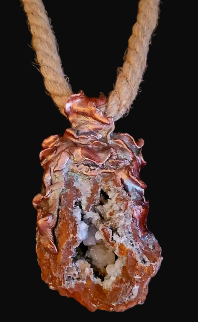 Rustic Crystal Geode Pendant - Hemp Rope Chest Piece Men