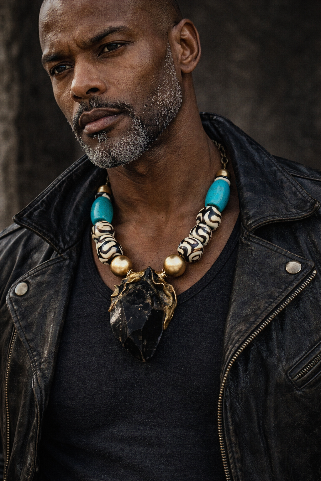 Earthy, bold, and unmistakably primal, Nomad’s Ember captures the raw alchemy of contrast — light and shadow, polish and imperfection. A hand-sculpted smoky quartz pendant anchors this statement piece, framed by metallic gold wood beads, magnesite turquoise barrels, and African zebu batik bone.
