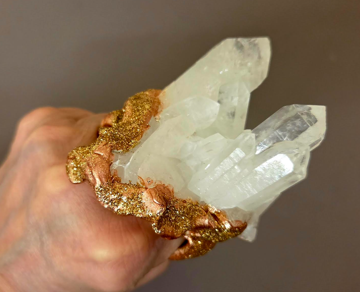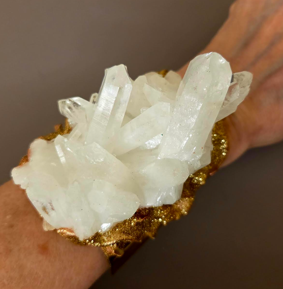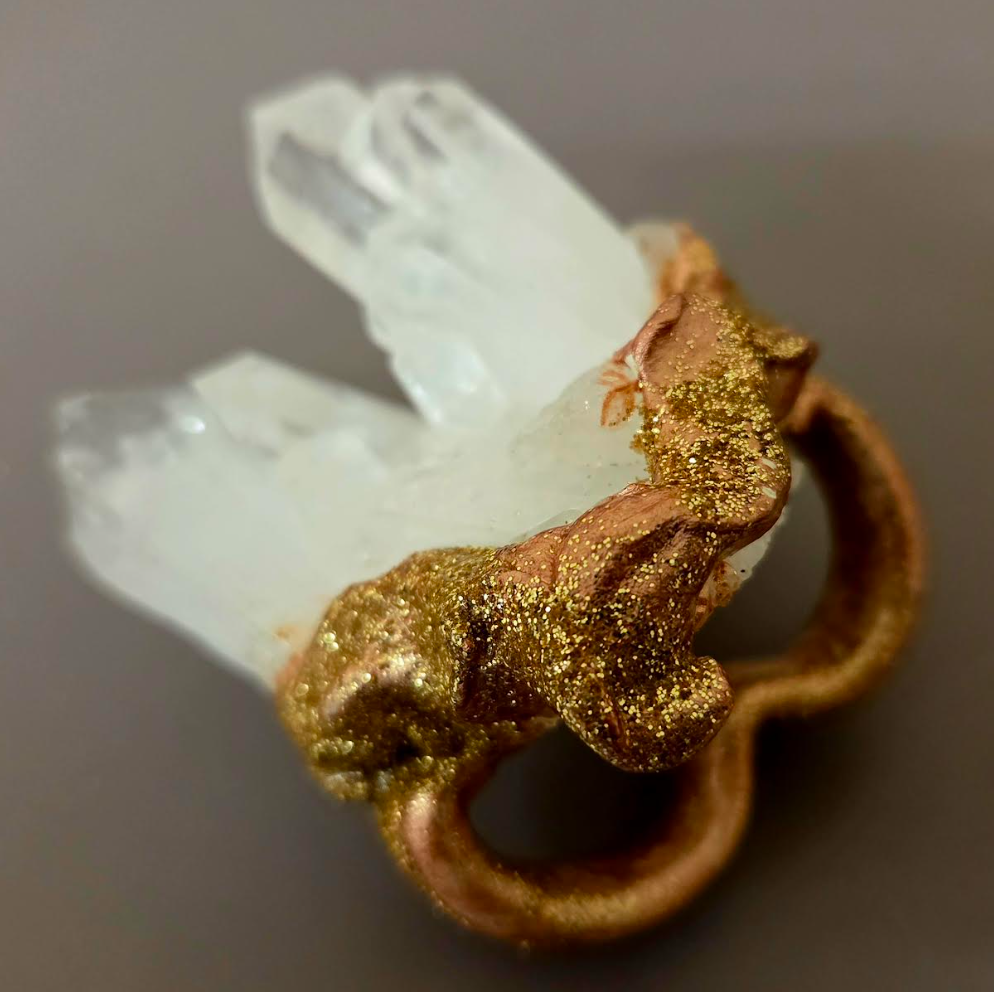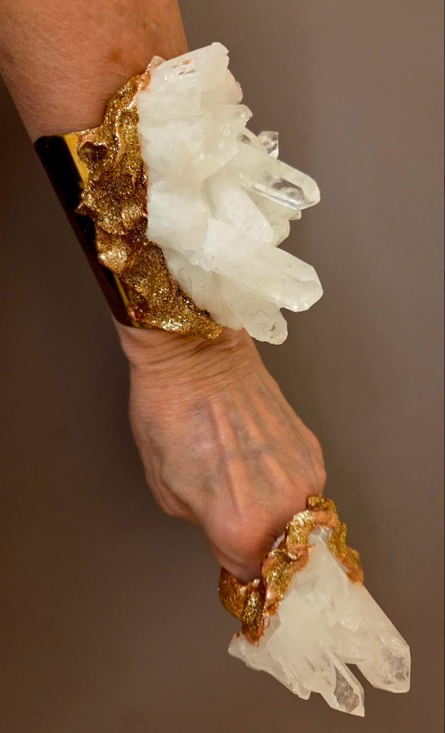The cuff showcases a dense spray of icy white quartz points rising from a molten, gold-and-copper textured base that wraps the wrist like flowing metal. The companion ring mirrors the design in a smaller scale, creating a powerful visual conversation between hand and wrist. Together they read as wearable sculpture—bold, architectural, and unabashedly luxurious. This is drama at it's finest!
