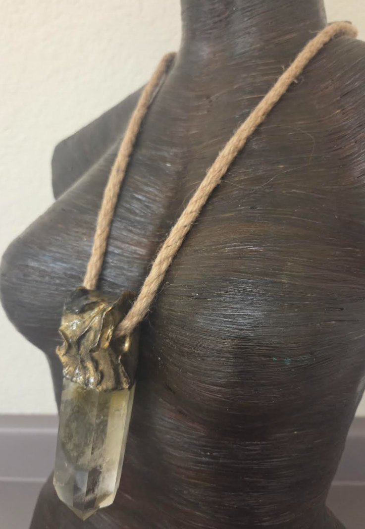 A massive smoky citrine phantom quartz point is hand-sculpted into a molten, gold-tone setting that hugs the top of the crystal like ancient armor. It hangs from a thick natural hemp rope for an earthy, grounded contrast to the opulent metalwork.