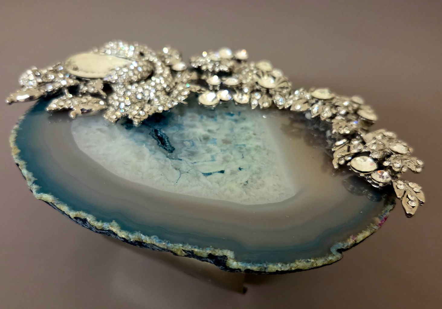This one-of-a-kind Kat Kouture statement cuff fuses natural geologic majesty with couture brilliance. A luminous slice of blue-gray agate—its crystalline heart shimmering with subtle frost tones—anchors a cascade of hand-set rhinestone florals that bloom across the wrist like frozen fireworks. Each crystal catches the light with hypnotic clarity, creating a wearable sculpture that blurs the boundary between jewelry and art.