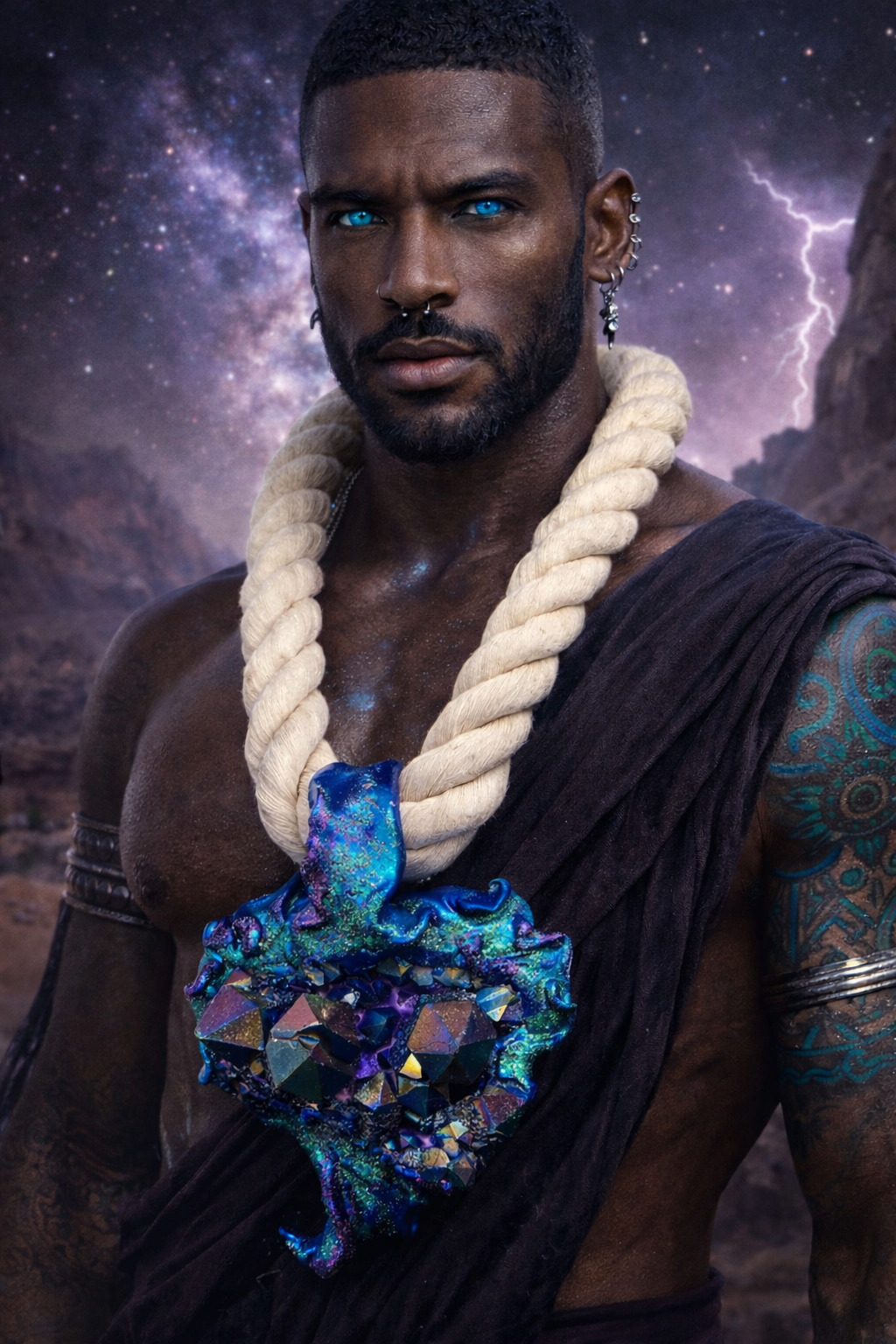 Here's another piece from my private collection, which is new and unworn. There is slight discoloration in a few spots on the rope which is barely noticeable, but I do mention it for transparency. It has been priced accordingly. This thick beige rope measures about 1.5" and supports a sculpted, painted, glittered and glazed titanium quartz pendant. The back is finished with hand sculpted end caps (I will touch up the paint before it ships). The piece measures a non-adjustable 35" and closes with an xl silver tone lobster claw clasp. The pendant measures approximately 6" x 5" from the bail to the bottom tip. This is a unisex styled piece and can is equally dramatic on either men or women. From the Atelier of Kat Kouture!