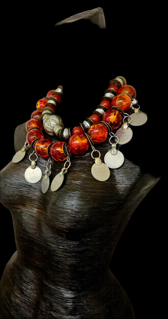 in the captivating allure of this exceptional tribal statement necklace, a harmonious convergence of rare and historically resonant elements. The eye is immediately drawn to the rich, translucent depths of prized Tibetan faux amber, each bead a testament to centuries of natural artistry. Interspersed with these luminous orbs are authentic vintage Kuchi coins, their intricate detailing whispering tales of nomadic heritage and enduring craftsmanship. This singular objet d'art that transcends indulgenment, offering the discerning collector a tangible connection to a vibrant past and an undeniably sophisticated present.