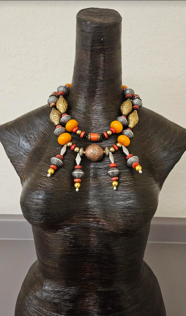 A quintessential lightweight and comfortable beaded chest piece for Autumn! This beaded chest piece is part of a set and includes the chevron, wood, coral and gold metal beaded, lightweight French hook pierced earrings, which measure 4" in length including the wire. The double strand necklace adjusts from 18-21" and closes with gold tone hardware, an "s" hook and a 3" extender chain with a beaded dangle. The components include an Ethiopian copper focal bead, Moroccan resin, gold tone repousse bi-cone beads, corals, silver tone stamped tribal bi-cones, chevron glass, black plastic spacers, an orange Tibetan capped bead and shiny gold metal balls. OOAK Wearable Art from the Atelier of Kat Kouture! A great choice for petite women and women of color!