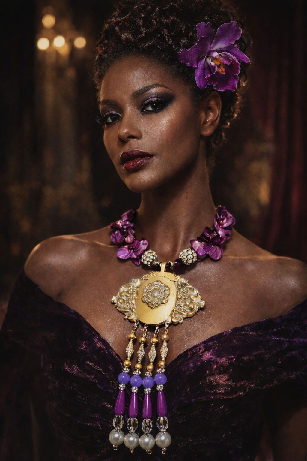 This is a piece I found while organizing my inventory. I upcycled a vintage, art nouveau brass belt buckle and used it as the pendant in this one-of-a-kind wearable art statement pendant or chest piece. Four beaded dangles are suspended from wires below the pendant, and the wires are pliable so if a dangle gets bent, simply straighten it out! The pendant measures approximately 5" in width and 7" in length. The necklace consists of rhinestone rondelles, titanium agates, rhinestone balls and purple MOP or abalone shells. Adjusts from 18-21" with silver tone hardware, a lobster claw clasp and a 3" extender chain. Lightweight and comfortable to wear. From the Atelier of Kat Kouture!