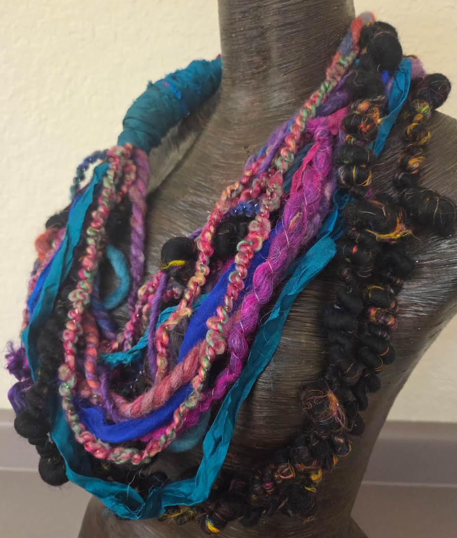 A little boho, a little gallery—it’s an easy, throw-on statement that still feels like art. This textile necklace layers strands of chunky art yarn, handspun-style fibers, and sari-style silk ribbons in saturated jewel tones: teal, magenta, violet, and deep blue with touches of black for grounding. The result is a soft, draped cascade that reads like a scarf and a necklace at the same time.