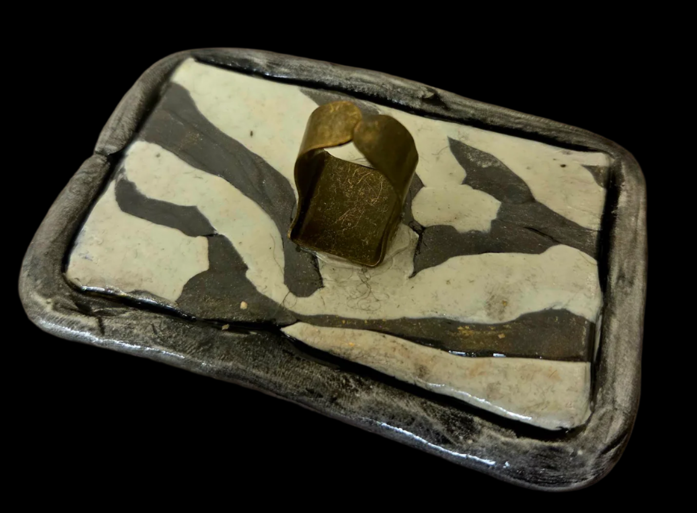 Urban Mirage is a bold, oversized statement ring, entirely hand-sculpted and caned, including its intricate faux-metal setting. Measuring 4.5" x 3", this piece is sealed with a high-gloss glaze that enhances its texture and ensures lasting protection.
